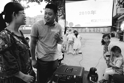 6月21日,由市政管理处下派到市中区龙山街道长乐社区的“第一书记”龚现亮(左二)为丰富社区居民业余文化生活,积极联系相关单位,组织社区居民观看红色电影和科教片,受到了居民的一致好评。 (记者 刘品 摄)