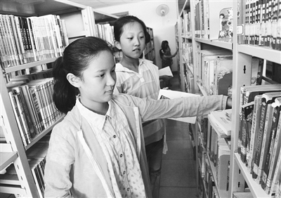 7月31日,两名小学生正在市图书馆借阅少儿图书。暑假期间,市图书馆为学生们设置了少儿阅览席,免费开放少儿电子阅览室,借阅少儿图书,吸引了不少中小学生在这里尽享读书的乐趣。 (记者 刘品 摄)