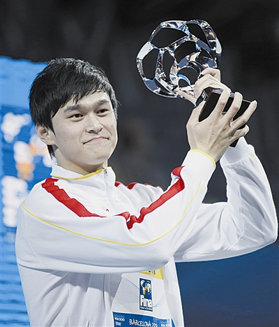 8月4日,中国选手孙杨在巴塞罗那卫冕世界游泳锦标赛男子1500米自由泳冠军,至此,孙杨在本届比赛中用3块自由泳金牌和1枚接力铜牌正式加冕“自由泳之王”,成为肩负起中国男子游泳领军人物的重任。图为8月4日,孙杨在颁奖仪式上获颁第15届世界游泳锦标赛最佳男运动员奖后展示奖杯。 (新华社记者 王丽莉 摄)