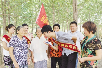 8月12日,大学生村官在向空巢老人示范讲解火灾逃生常识。为关爱农村空巢老人,台儿庄区泥沟镇组织大学生村官组成关爱老人志愿者服务队,为农村空巢老人进行健康咨询、阅读书报等服务,开展火灾、触电等应急避险宣传教育。 (刘凤琦 李昱博 摄)