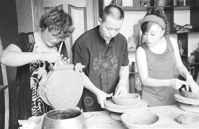 8月12日,在山亭区西集镇伏里村甘言地(中)伏里土陶作坊,来自央视的记者(右一)在饶有兴趣地学做土陶作品。当日,伏里土陶传人甘言地接受了央视记者的采访。 (赵连友 摄)