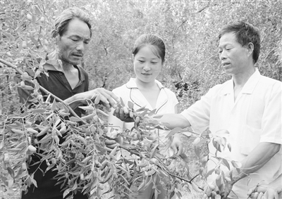 8月23日,阴平镇斜屋村土专家陈玉玺(右一)在指导枣农管理枣树。由于今年气温较高,极易造成果树发生病虫害,严重影响果树的成长和结果。对此,峄城区积极组织农技专家深入到果园,现场诊断果树病情,及时解答果农提出的疑难问题,并提出了行之有效的解决防治措施。 (孙启路 摄)