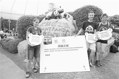 8月23日,“熊猫守护使”梅莉萨·卡茨、杰罗姆·普伊和陈寅蓉(从左至右)在香港海洋公园熊猫馆前参加寄语“熊猫之城”活动。当日,“全球熊猫守护之旅”在香港海洋公园正式揭开帷幕,3位“熊猫守护使”将前往全球所有大熊猫所在的国家和地区,进行关于大熊猫和当地濒危物种繁育保护的交流活动。 (新华社发)