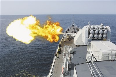 8月24日至25日,中国海军第十四批护航编队与同在亚丁湾海域执行任务的美国海军梅森号导弹驱逐舰举行中美海上联合反海盗演练。图为中国海军哈尔滨舰主炮进行“对海攻击”。