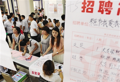 8月27日,大学毕业生正在咨询招聘岗位。当日,我市“就业金桥”高校毕业生专项招聘会暨“2013年高校毕业生就业服务月”启动仪式在市人才交流市场举行,共吸引2000余名高校毕业生前去应聘。 (记者 刘品 摄)