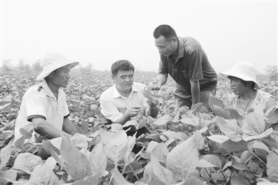 时下正值秋季农作物管理的关键时期,峄城区组织农技人员深入田间地头为农民讲解秋管知识,指导农民及时加强对玉米、大豆等秋季作物的田间管理,力夺秋粮丰收。图为农技人员在向农民讲解大豆管理技术。 (孙启路 郝若愚 摄)