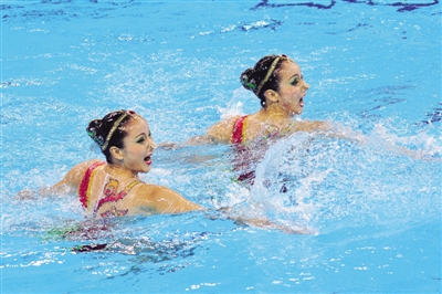 9月1日,蒋文文/蒋婷婷在比赛中。当日,在大连举行的第十二届全运会花样游泳双人技术自选预赛中,四川队选手蒋文文、蒋婷婷以47.563分暂列预赛第一。 (新华社发)