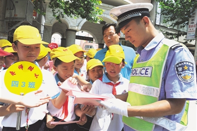 ←9月1日,市交巡警部门深入全市各中小学校,以“美好梦想·安全起步”为主题,为学生们上了新学期交通安全第一课,提高了学生们的交通安全意识和安全防范能力。图为民警在为学生们发放交通安全资料。 (记者 张磊 摄)