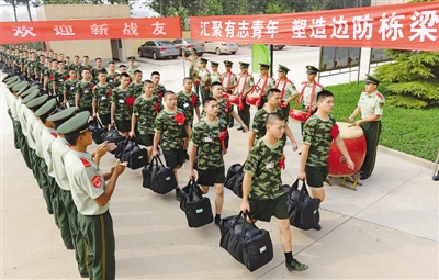 9月6日,河北公安边防总队的老兵在迎接新兵。当日,来自江苏、河北等地的数百名新兵,陆续抵达河北公安边防总队新兵训练团。他们将严格按照训练大纲要求进行为期两个多月的训练,随后奔赴河北公安边防一线。 (新华社发)