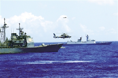 当日,中美两国海军在夏威夷附近海域举行了复杂条件下海上联合搜救演习,双方共4艘舰艇、3架直升机参加,这是7年来中美首次联合演习。演习中,双方互派了军事观察员,两国海军实现了直升机首次编队飞行、首次成立联合离舰损管队、空中兵力首次联合搜索同一海域等多项跨越。参演兵力包括中国海军青岛舰、临沂舰和一架舰载直升机,美国海军导弹巡洋舰伊利湖舰、一艘辅助船和“海鹰”、“黑鹰”直升机各一架,两国海军参演官兵近1000名。 (新华社发)