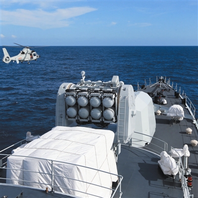 9月15日,在中国海军舰艇编队穿越赤道时,“直九”型舰载直升机同时进行了飞越赤道训练。