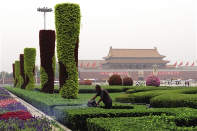从9月11日起,北京天安门广场和长安街沿线的国庆花坛布置正式开始,预计9月25日全部完成。据了解,北京今年的国庆花卉布置将整体“瘦身”,天安门广场及长安街两侧的摆花量均有所减少,市属政府机关门口也不再摆放大型花坛。 (新华社发)