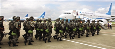 铁路输送无站台应急卸载,军用和民航飞机同步投送,海上登陆舰艇航渡运送……连日来,参加“使命行动—2013A”跨区机动参演部队,在复杂情况下,同时采取空中投送、海上航渡、铁路输送和摩托化开进等多种方式,向数千公里外生疏地域展开远程立体兵力投送。 (新华社发)