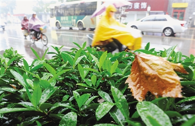 ←昨日,行人在雨中前行,一片树叶被雨水打落。当日是二十四节气中的“秋分”,我市普降中雨,气温再次走低,使市民感到丝丝凉意,秋意渐浓。据市气象台预报,今明两天我市最低气温将降到12摄氏度,提醒市民出行时注意适当添衣保暖。 (记者 刘品 摄)