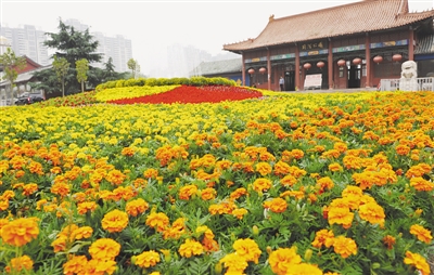 今年国庆期间,我市天气良好,秋高气爽,市内各景区披上了各种鲜花组成的节日盛装,增添了许多喜庆色彩。但是与往年相比,今年国庆鲜花摆放变化不少,数量上减少了,复杂、大型花卉消失了,花期长、耐寒、简洁实用的花草成为主流,让市民在节俭中体验了浓浓的节日气氛。图为:滕州市荆河公园门前鲜花宜人。 (记者 刘品 摄)