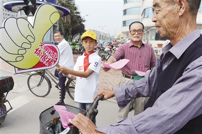 10月7日,光明路小学5年级学生宋昌乐和姥爷一起在青檀路二棉岗亭开展交通文明劝导亲子体验。9月份以来,团市委、市教育局、市交警支队联合在全市中、小学校开展小交警志愿服务日活动,通过交通安全主题班会、文明出行亲子体验、上路开展交通安全劝导服务等活动,让每一名少先队员养成良好的交通安全习惯。 (记者 张晶 摄)