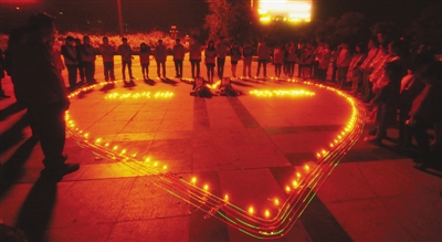 10月13日晚,滕州市1000余名社会各界群众在龙泉广场为救火英雄刘洪坤(滕州籍)、刘洪魁举行烛光悼念仪式,人们用1000多支点燃的蜡烛组成心字形和两位英雄的名字,寓意救火英雄永远活在我们心中,沉痛悼念为保卫人民财产而英勇献身的英雄,并向英雄致敬!祝英雄一路走好。据悉,10月11日凌晨,北京石景山区喜隆多商场发生火灾,当日并不值班的石景山消防支队参谋长刘洪坤主动请缨赶赴现场,参与火灾扑救。6时10分,刘洪坤带领八大处消防中队副中队长刘洪魁,再次进入火场进行侦查,后因火势迅速蔓延,建筑突然坍塌,两人不幸牺牲。 (侯志龙 摄)