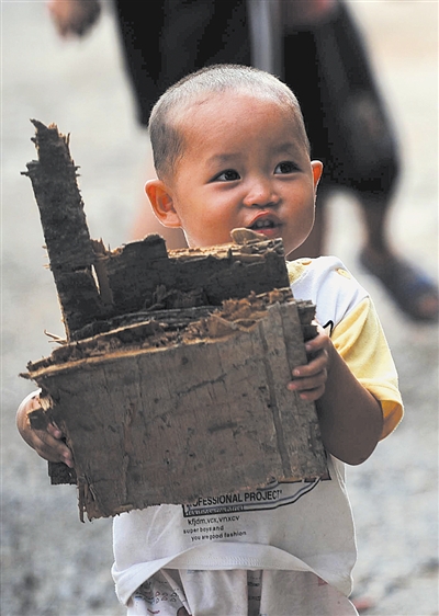 在广西柳州市石烂路一处外来务工人员聚居地,2岁的陈丽娜帮奶奶搬柴火(8月8日摄)。