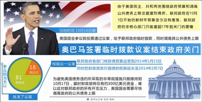 美国白宫17日凌晨宣布,总统奥巴马已将国会参众两院刚通过的联邦政府临时拨款议案签署成为法律,此举标志着持续半个多月的联邦政府非核心部门“停摆”风波结束。