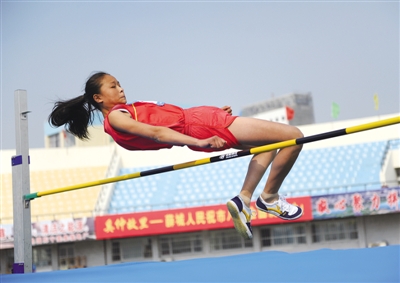 昨日,市八运会各项比赛继续进行,当天共进行了43个项目的比赛,产生31枚金牌。图为女子五项全能跳高项目的比赛。 (记者 刘品 赵宁 摄)