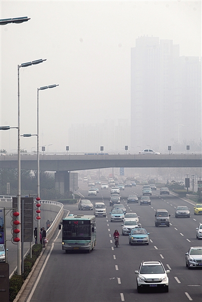 10月28日,天津城市快速路河东区路段,车辆在雾霾中行驶。