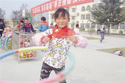 10月29日,市中区税郭镇第二联校五年级学生在做呼啦圈。当日,由省体彩管理中心、生活帮联合主办的2013“公益体彩 快乐操场”枣庄捐赠启动仪式在该校举行,市体彩中心、市体育局为该校赠送了兵乓球台、足球、篮球、呼啦圈等价值一万多元的体育器材和用品。 (黄家芳 李庆国 摄)