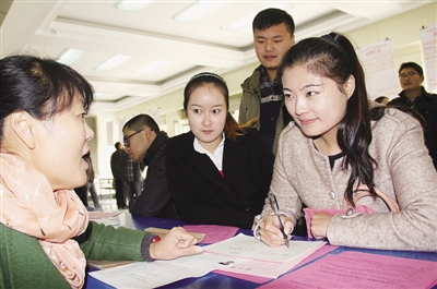 11月12日,台儿庄区举办了2013年高校毕业生专场招聘会。来自省内外的50多家企业提供了管理、普工和专业技术等类别的岗位4000多个,1000余名求职者进场参加招聘,800余人初步达成了就业意向。图为招聘会现场,工作人员指导高校毕业生填写用工登记表。(张严新 刘光辉 摄)