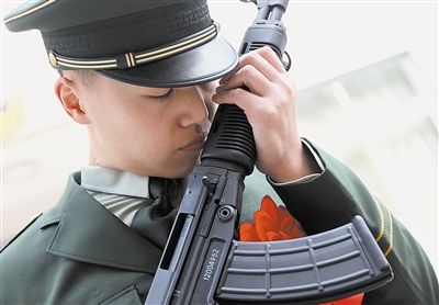 11月24日,河南漯河籍退伍战士刘卓嵘离开部队前依依不舍地亲吻武器。当日,武警上海总队三支队百余名战士退伍返乡,老兵们带着无悔的青春,告别成长的军营,开始踏上新的人生旅程。 (新华社记者 陈飞 摄)