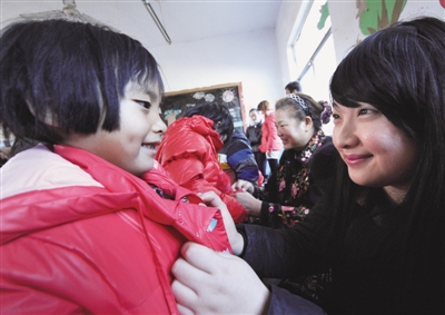 11月27日,由山东广播电视台主办、山亭区团委和义工协会协办的2013 “暖冬行动”在徐庄镇光彩幼儿园启动。爱心单位和人士为40多名山里娃赠送了羽绒服和学习用品,并安装了一套取暖设备,确保孩子们在温暖的教室里读书学习。图为爱心人士为小朋友试穿羽绒服。 (李宗宪 李刚 摄)