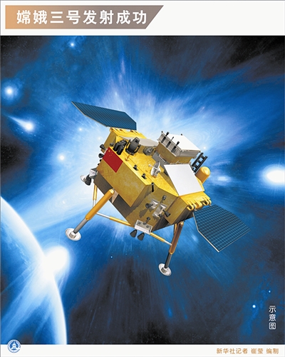 12月2日1时30分,搭载着嫦娥三号的长征三号乙运载火箭在西昌卫星发射中心发射升空。由着陆器和“玉兔”号月球车组成的嫦娥三号月球探测器,总重近3.8吨。在月球表面软着陆后,“玉兔”号将驶离着陆器进行为期约3个月的科学探测,着陆器则在着陆地点进行就位探测。 (新华社记者 李刚 摄)