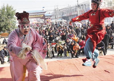 11月29日,市艺术剧院的演员在山亭区桑村大集表演豫剧《郎才女貌》。冬闲时节,市艺术剧院利用“流动舞台车”开展送戏下乡活动,把一出出精彩的戏剧送到农民家门口,丰富冬闲时节的农民文化生活。 (李宗宪 陈永 摄)