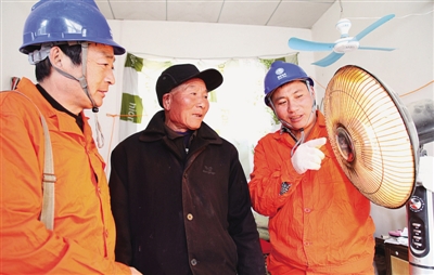 近日,国网枣庄供电公司台儿庄客服中心开展“暖阳行动”,组织5个党员服务队对辖区内65岁以上的老人进行统计,为空巢、孤寡老人建立爱心服务档案,组织队员定期为他们进行电力服务,让老人们用电更加安心。图为服务队队员在为老人讲解电暖器、电褥子等安全用电常识。 (张严新 贾广立 摄)