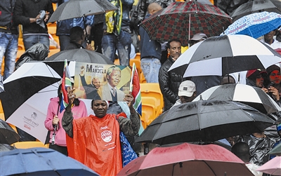 →12月10日,在南非约翰内斯堡,南非民众在雨中参加前总统曼德拉追悼大会。 (新华社发)
