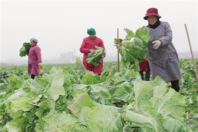 12月10日,税郭镇大辛庄村民在杨宁蔬菜基地内收获白菜,由于气候适宜,今年市中区2万亩大白菜喜获丰收,预计亩产可达8000斤以上。目前市场价格稳定在0.6元每公斤左右,种植户较往年增收二到三成,可谓丰产又增收。 (黄加芳 摄)