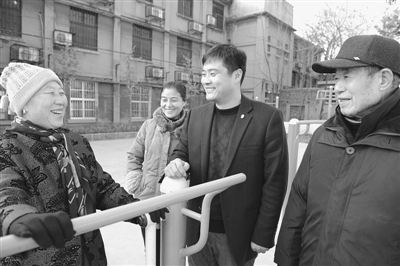 市中区城管局下派到中心街街道新风里回族社区担任“第一书记”的吕强,到村任职以来,千方百计为群众办实事、解难事。针对回族社区建成时间较早,路灯无法正常使用的实际,他积极协调资金4万元更换了社区内路灯,方便居民夜晚出行。同时,还在小区安装了健身器材,方便居民健身。图为吕强(中)在与居民亲切交谈。