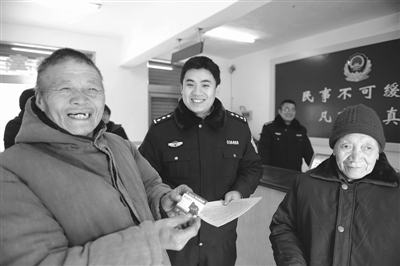 →12月17日,峄城区坛山街道的任泽喜和老伴来到派出所,向民警王超“索要”警民联系卡。针对坛山街道孤寡老人多的实际,王超和同事印制了警民联系卡、防诈骗温馨提示卡等,竭尽所能帮助老人解决生活中遇到的难题。(记者 张晶 摄)