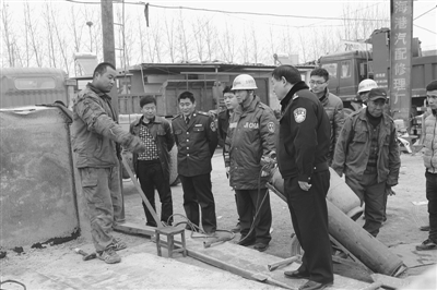 连日来,台儿庄区公安分局联合交通、质监、煤炭等部门,对全区17家汽车维修厂家、企业进行了“拉网式”排查,从源头上杜绝非法改装车辆的产生。图为执法人员在排查“车辆改装”企业。 (尚培雷 摄)