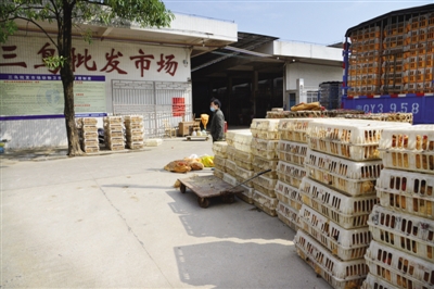 →12月23日,广东省阳春市三鸟批发市场外堆积着等待清洗消毒后进入市场的禽类。