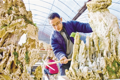 隆冬时节,山亭区水泉镇130多户农民将自家庭院改建成温室大棚,避开严寒,在温暖如春的环境里进行奇石盆景的加工制作,增加家庭收入。图为下辛庄村农民李修甫(前)在庭院温室雕刻奇石盆景。 (刘明祥 摄)