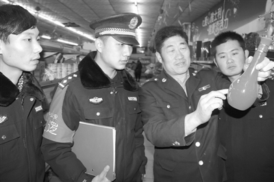 春节将至,市中区组织食品药品、工商、派出所等部门,对涉及食品制造和销售的单位进行联合执法检查,确保春节期间食品安全。图为:1月7日,执法人员在超市里检查。 (黄加芳 摄)