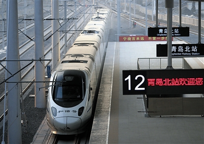 青岛北站作为现代化的交通枢纽,旅客不用出站就能实现与地铁、出租车、公交车、长途车等各种交通工具的“零换乘”,做到第一时间在青岛北站分散人流和物流。图为一列动车经过青岛北站。