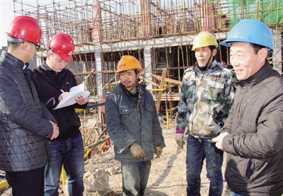 下图:在台儿庄区某工地,工作人员在调查农民工工资发放情况。连日来,台儿庄区进行了农民工工资专项检查,追缴农民工工资保证金、劳动保障金600多万元。