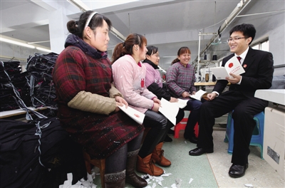 上图:市中区法院组织法官到企业走访,与农民工面对面聊天,了解企业发放农民工工资的真实情况。 (吉喆 种法亮 摄)