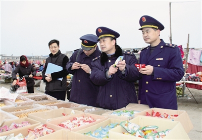 →1月10日,市中工商分局执法人员正在检查节日商品。新春佳节临近,我市工商部门积极开展节日市场专项检查活动,重点对流通领域乳饮料、食用油、酒水、肉类等商品进行拉网式检查,确保群众节日食品消费安全。(张冬磊 摄)