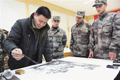 1月17日,书画家现场创作书画作品。随着春节的日益临近,市总工会组织书画艺术家开展“迎春书画进军营”活动,书画家们挥毫泼墨,为官兵送字画送春联,并传授书画创作技艺,受到了官兵们的欢迎。 (记者 刘品 摄)