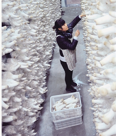 去年以来,薛城区积极推进农村土地流转工作,累计流转土地8.53万亩。催生了一批农产品加工企业、农民专业合作社等,同时带动劳动力转移约3.65万人,实现劳务收入5.84亿元。图为村民正在土地流转大棚采摘杏鲍菇。