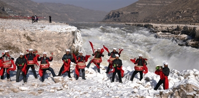1月25日,民俗演员在黄河壶口瀑布景区为游客表演斗鼓。当日,受凌汛影响一度关闭的黄河壶口瀑布景区重新开放迎宾,游客可近距离欣赏“冰瀑玉壶”的壮丽景观。