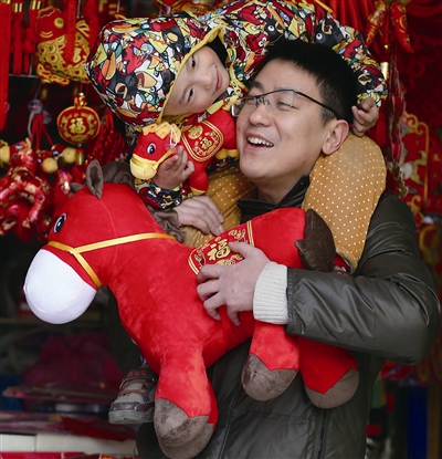 ←2014年1月25日,在西安市城隍庙市场,一名小朋友与爸爸手拿着“大马”和“小马”布偶。马年将至,各地民间艺人创作、制作以马为主题的艺术作品,迎接新春的到来。