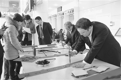 1月27日、28日,建行枣庄分行开展“喜迎新春,马年送福”活动,组织有书法特长的员工在营业大厅现场为客户书写春联,向客户致以节日的祝福。书写者按客户需求即时挥毫,现场制作,受到客户好评。 (李秀光 摄)