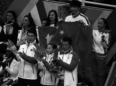 ↑2月6日,中国花样滑冰队主教练赵宏博(前排右一)带领队员在为闫涵加油。当日,在2014索契冬奥会花样滑冰团体赛男子单人滑短节目比赛中,中国选手闫涵获得85.52分。